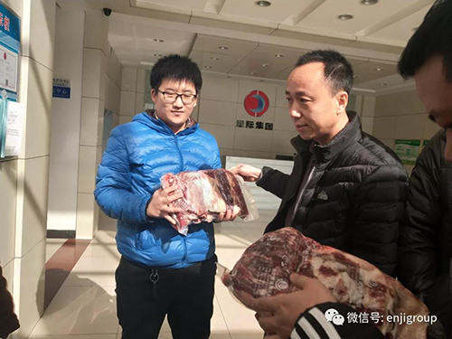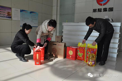 2018年2月8日,為使員工過(guò)一個(gè)快樂(lè)祥和的春節(jié),恩際集團(tuán)為員工發(fā)放了大米、油和酒等過(guò)年福利物品,同時(shí)為員工提供了產(chǎn)自欣發(fā)牧業(yè)公司的低價(jià)、優(yōu)質(zhì)、生態(tài)牛肉1500斤。