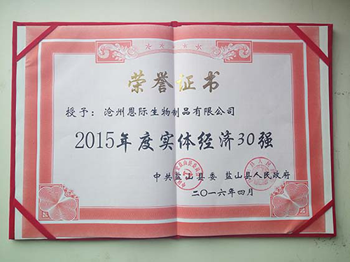 熱烈慶祝滄州恩際生物制品有限公司榮獲2015年度實體經(jīng)濟30強榮譽
